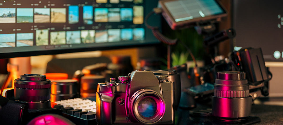Creative Video Editing Desk Retro Camera Lens Monitor Setup featuring a vintage-style camera, multiple lenses, modern video editing screens and professional post-production workflow tools. Perfect workspace for content creators, filmmakers, and visual artists. Keywords
